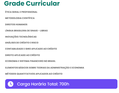 O curso de pós-graduação em Gestão de Crédito e Cobrança tem como objetivo promover profissionais para atuar estrategicamente na análise, concessão e recuperação de crédito, com foco na minimização de riscos e otimização de resultados. Desenvolve competências em gestão financeira, técnicas de cobrança, análise de inadimplência e uso de ferramentas tecnológicas para tomada de decisão. Além disso, promove o entendimento de aspectos legais e éticos, alinhando estratégias de crédito e cobrança aos objetivos das organizações e ao mercado financeiro.