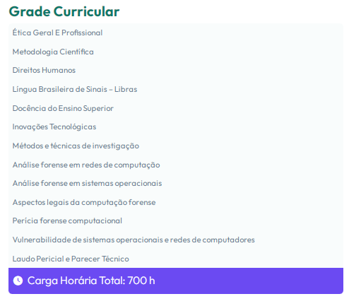 O curso de pós-graduação em Perícia Forense Computacional tem como objetivo capacitar profissionais para investigar, analisar e preservar evidências digitais em crimes cibernéticos. O curso aborda técnicas de perícia digital, segurança da informação, recuperação de dados, análise de malware e legislação aplicada. Destina-se a profissionais das áreas de TI, direito e segurança que desejam atuar em investigações forenses, auxiliando órgãos governamentais, empresas e escritórios jurídicos na identificação e mitigação de ameaças digitais e fraudes eletrônicas.